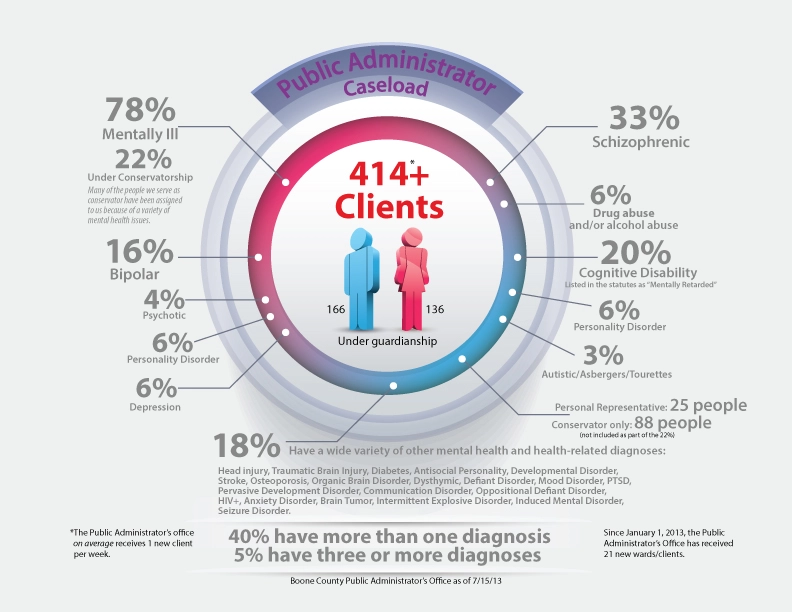 Boone County's Public Administrator's Office presently carries an open caseload of around 437. Clients reside in Boone County or, for various reasons, other areas of the State and in several other states, as well. Note: This is because some facilities may be better equipped to administer to clients with special needs and it is important to try and locate clients near family. Of the 400 plus clients under guardian and/or conservatorship, approximately 87% have been diagnosed with a mental illness.